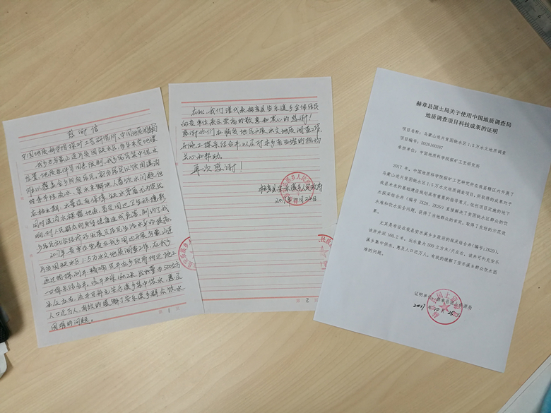 當?shù)卣謩e給實施該項目的中國地質(zhì)調(diào)查局、中國地質(zhì)科學院探礦工藝研究所以及我院授予錦旗,并親筆手寫感謝信,感謝項目組在脫貧地區(qū)開展水文地質(zhì)調(diào)查和施工探采結(jié)合井工作,以及對地方老百姓的熱切關(guān)心和幫助。