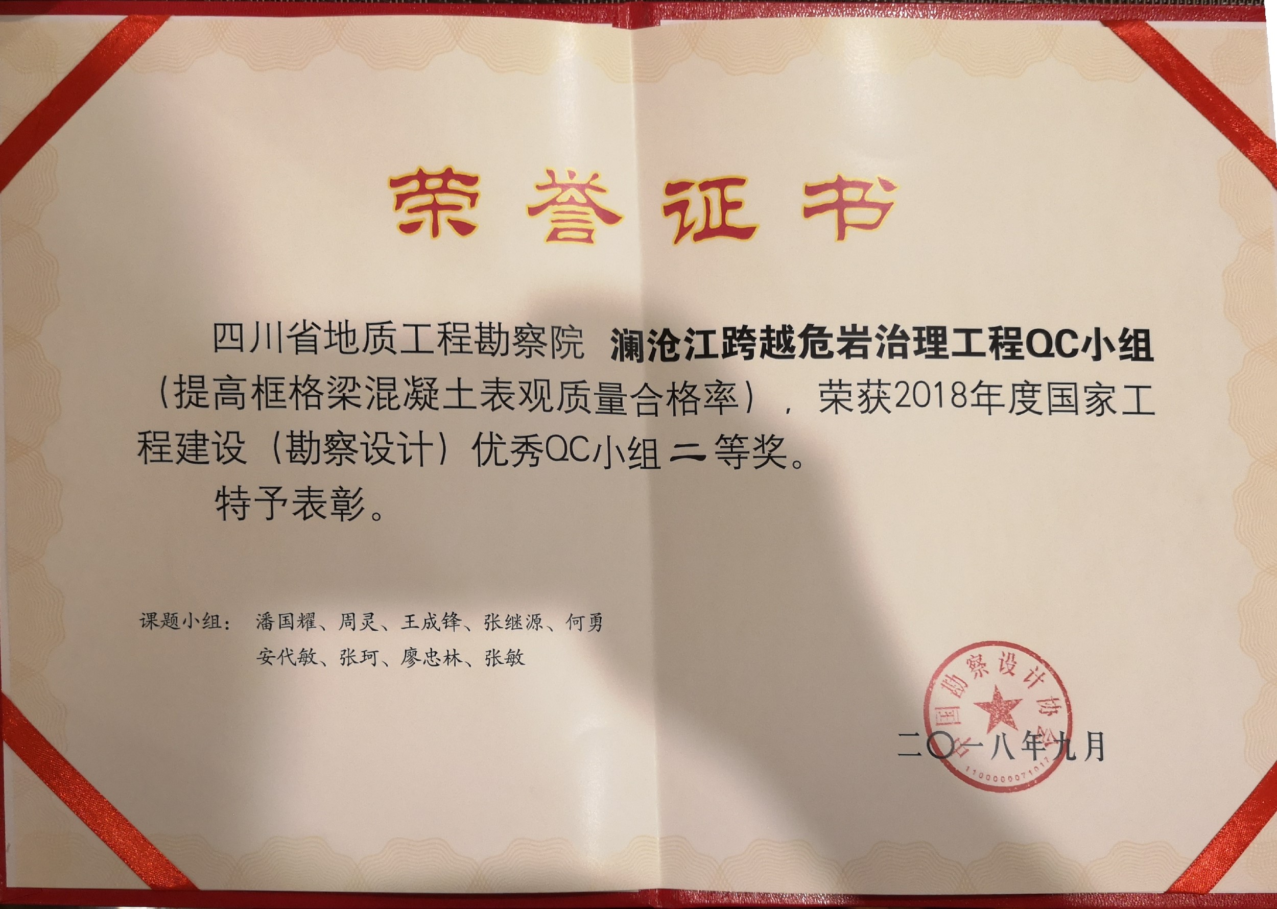 近日,我院瀾滄江跨越危巖治理QC小組在2018年度國(guó)家工程建設(shè)(勘察設(shè)計(jì))優(yōu)秀質(zhì)量管理(QC)小組評(píng)選會(huì)上榮膺二等獎(jiǎng)。這是繼2004年我院“資陽(yáng)市雁江區(qū)紅層找水打井項(xiàng)目”榮獲QC一等獎(jiǎng)之后時(shí)隔十五年獲得的第二個(gè)國(guó)家級(jí)QC獎(jiǎng)項(xiàng)。