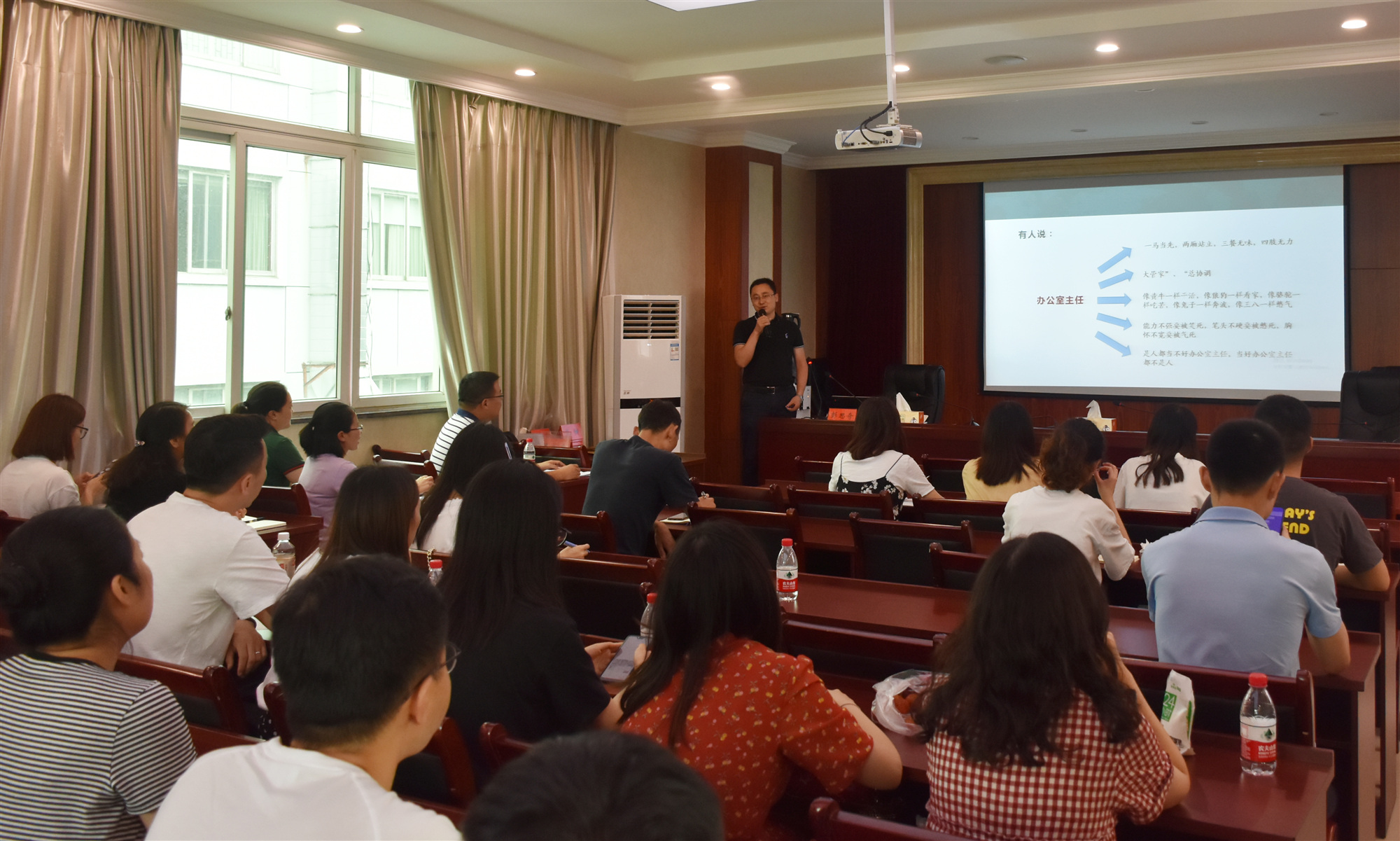 為全面提高院管理水平,切實(shí)提升職工業(yè)務(wù)素質(zhì)與綜合服務(wù)能力,6月20日,院綜合管理部組織開展“2019年度實(shí)體辦公室工作人員、經(jīng)營人員培訓(xùn)會”,特邀職業(yè)禮儀師張?zhí)鸷退拇ㄊ⊥艘圮娙耸聞?wù)廳辦公室主任彭思奇授課。黨委書記謝大軍親臨會場,并作動(dòng)員講話,來自管理部門及二級實(shí)體的70余人參加了培訓(xùn)。